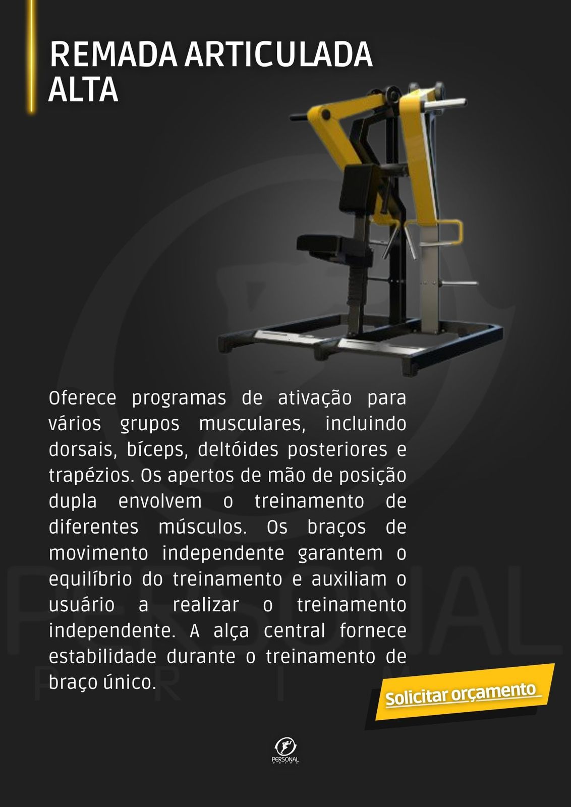 A Remada Articulada Alta Premium oferece programas de ativação para vários grupos musculares, incluindo dorsais, bíceps, deltóides posteriores e trapézios.